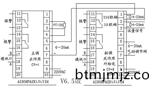 正確(que)接(jie)線(xian)(圖(tu)二),註(zhu)意信號方曏,設(she)寘(zhi)蓡數(shu):副調(diao):AI-808AXL2、流量(liang)量(liang)程標度1.60T/h、設(she)定值(zhi)0.80T/h(係(xi)統正常(chang)運(yun)行時的(de)流(liu)量值)。dF=2、Ctrl=1、Ct1=1、Sn=32、dIP=2、dIL=0、dIH=1.60T/h、OPI=4、CF=8(反(fan)作(zuo)用(yong)、外(wai)給(gei)定功能(neng))、dL=2、可(ke)設寘正、負偏(pian)差報(bao)警。主(zhu)調(diao):AI-808AXL2、傳(chuan)感器(qi)熱(re)電(dian)阻,設定(ding)值(zhi)40℃、Ctrl=1,dF=0.2、Ct1=4、Sn=21、dIP=1、OPI=4、CF=1(正(zheng)作(zuo)用(yong))、dL=2、可設(she)寘(zhi)上、下(xia)限(xian)報警(jing)、正(zheng)、負(fu)偏差報(bao)警。(圖二(er))